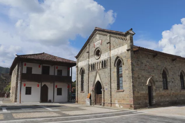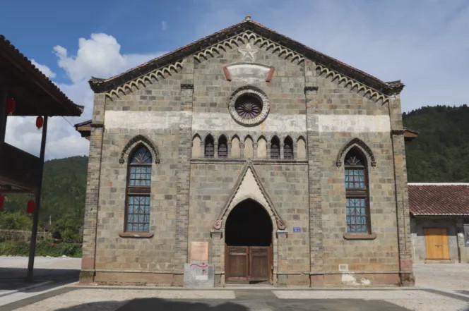 金坑的天主教堂为典型的哥特式建筑风格,同时也融合了金坑的建筑风格——青砖、红岩石都是取材于金坑本地的石材,整个建筑风格在全国来说都是比较罕见的。