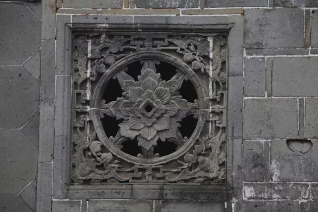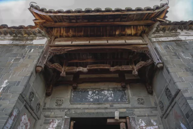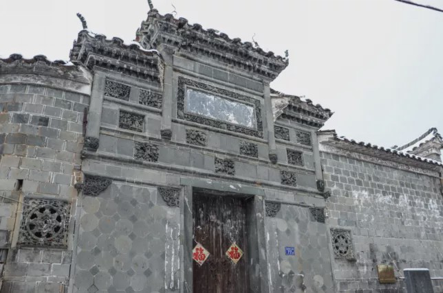 它的正门有别致的塔头屋顶,凤头冲角,衬旁的方块砖雕,画面布局极为精微:有寿、禄、福、喜、平安、花开富贵等含义深刻的吉祥图案。