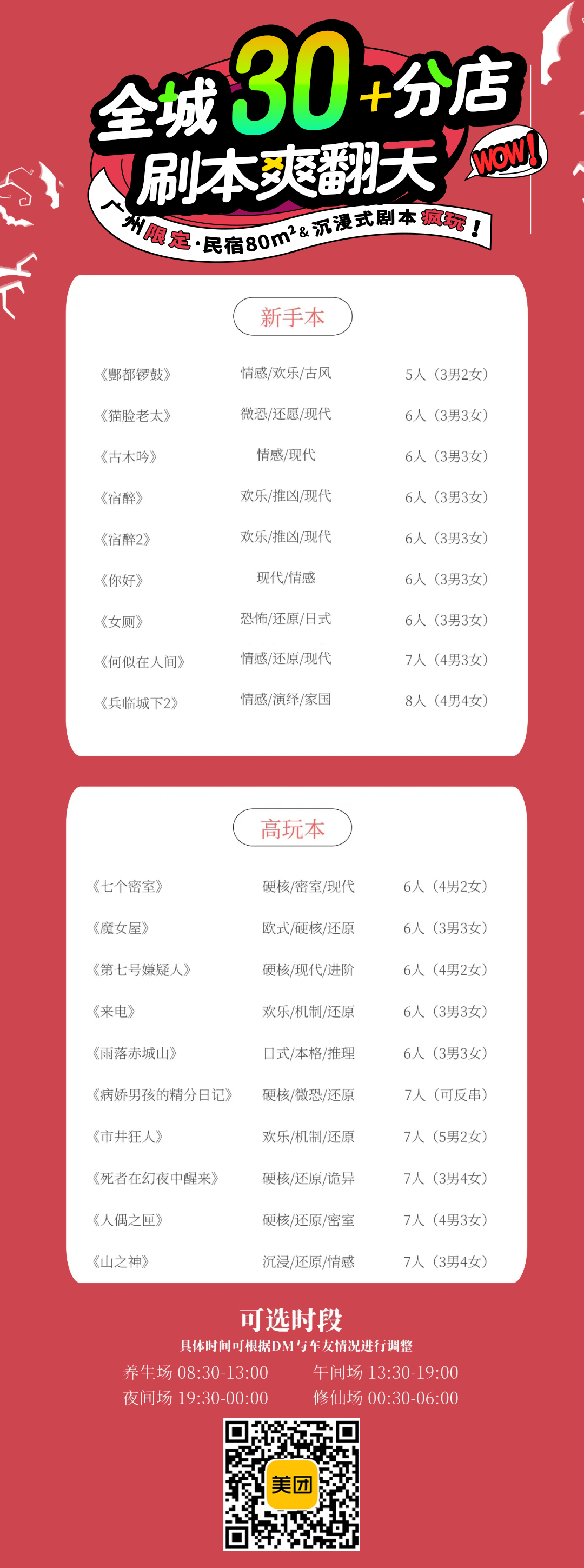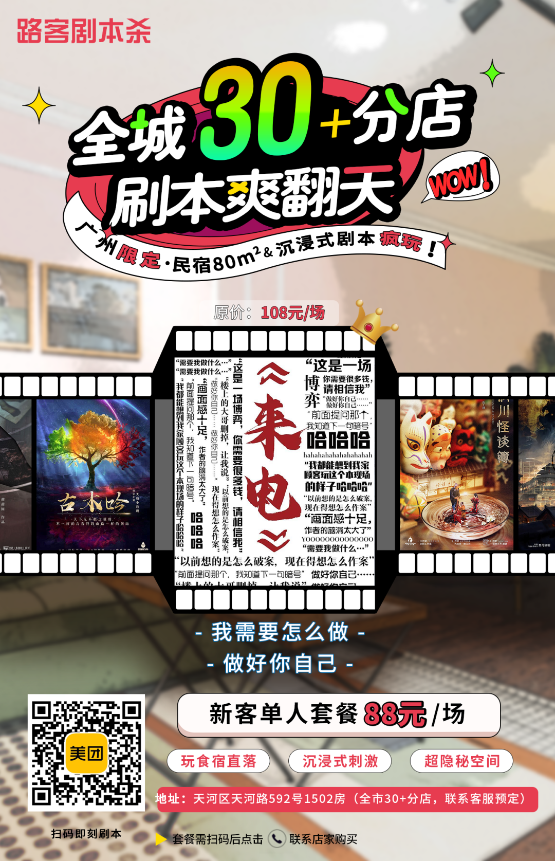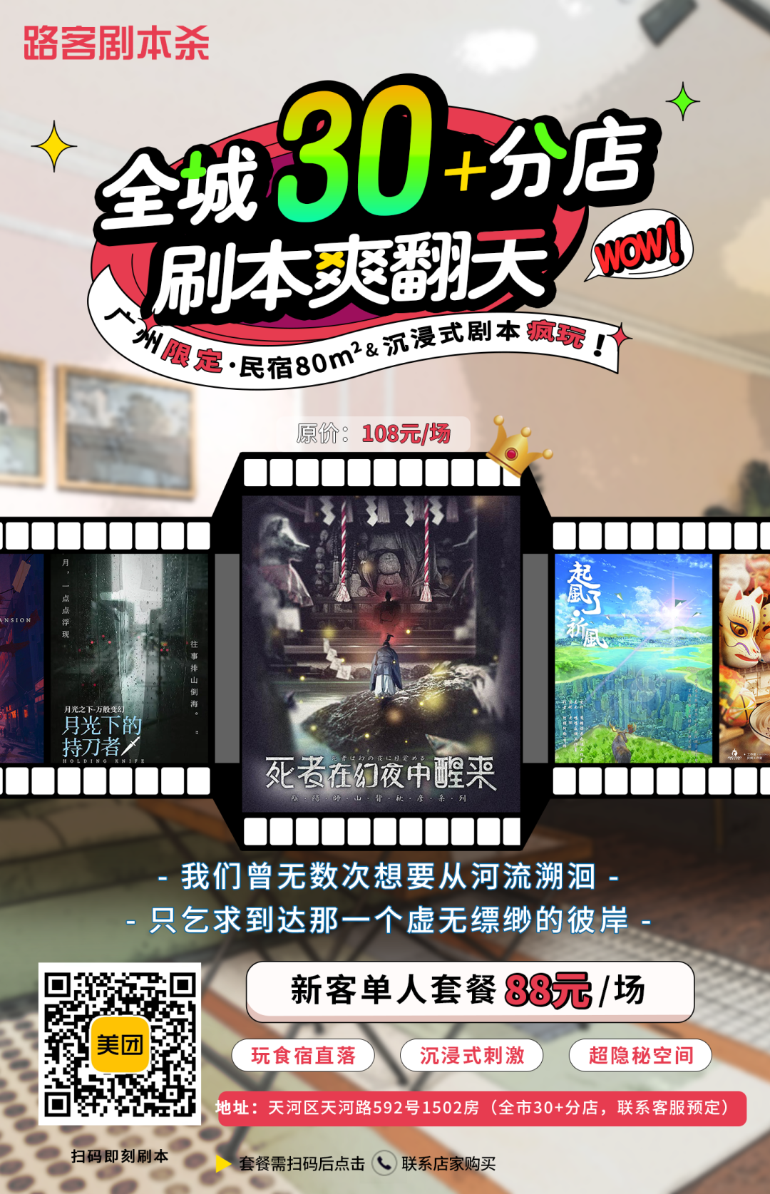 广佛全城30+剧本杀场地,20+不同风格剧本任选,无论你是新手玩家还是高能玩家,都能找到适合自己的玩法!还有超大私密民宿空间,给你沉浸式剧本体验,让你放心疯玩!