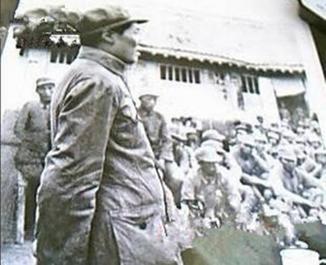 毛主席默哀毕,缓缓转过身子,走上一个土台子,此时会场上一派肃穆,不时听见同志们的哭泣声。
