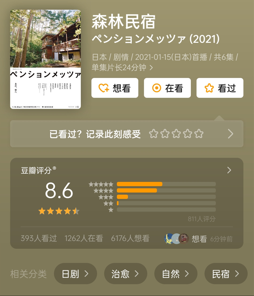 由松本佳奈和小林聪美继《面包和汤和猫咪好天气》之后,再次合作的温馨治愈小剧《森林民宿》,女主角在位于森林的独栋房子里,一个人经营着民宿。她告诉你经营民宿的原因,有一个理由就是,希望得到别人的反馈,不然会感觉意志消沉。