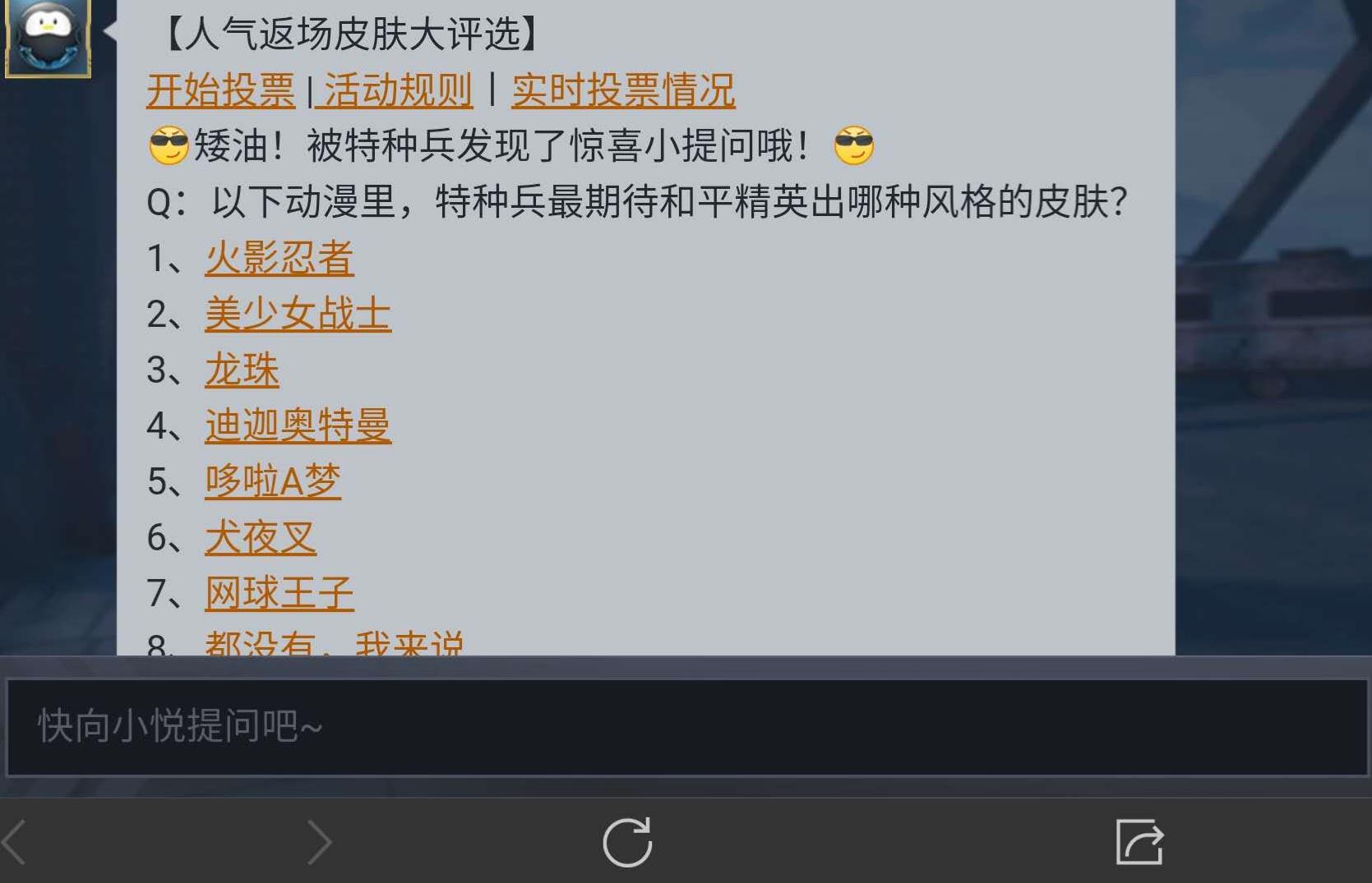需要特别提到的是,在《和平精英》人气皮肤评选的活动中,光子还可以向玩家提供了一个小的调研活动,询问玩家:在以下这些动漫中,大家最期待《和平精英》更新哪种风格的皮肤。