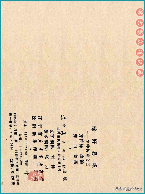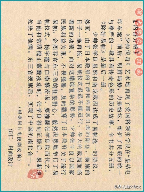 【内容介绍】辽宁美术出版社于1985年出版的连环画套书《少帅传奇》,全书共5册,印数76万册。这套连环画艺术地再现了爱国将领张学良在“皇姑屯炸车案”前后,明察局势,力排纷纭,维护了民族的统一与尊严的一段具有传奇色彩的历史故事。第五册简介:少帅张学良虽然和南京政府达成了易帜统一的协议,然而,由于日本政府的干涉和内部亲日派的阻扰,换旗的日子一拖再拖,易帜仪式迟迟不能进行,奉天的局势面临新的动荡。面对这错综复杂的形势,张学良以国家利益为重,不畏强暴,及时戳穿了日本政府妄图吞并东三省的狂妄野心,毅然决然地举行了易帜仪式。杨宇霆与白崇禧密谋,要推翻张学良取而代之。张学良得到证据后,果断地处决了杨宇霆和常荫槐。东北三省换旗后,实现了中国的南北合一。