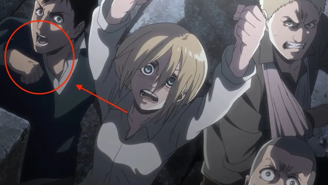 第二季,众人所藏身的石塔倒塌,在无人注意的角落,为求自保,“超大型巨人”宿主贝尔托特做出了一个咬手的预备动作(变身巨人前的触发条件)。人物的身份被精准地植入其无意识动作之中。