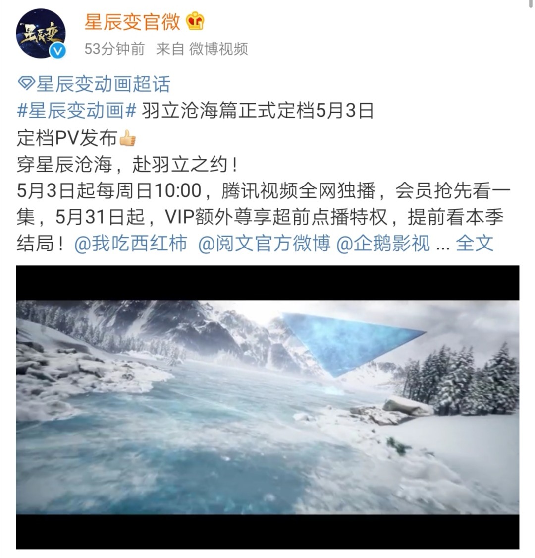 官微同时也发布了《星辰变》的定档海报,第一季中,星辰变也是凭借着精美的画质以及人物形象的生动灵巧加上对漫画原作的还原度获得好评!第二季“羽立沧海”由福煦影视制作,在各方面都更加的精赞,给人的全新的视觉体验;阅文集团与企鹅影视联合出品,腾讯视频独播!会员依然可以享受提前观看一集的特权,5月31日起,会员可以享受超前点播特权,提前观看本季结局!