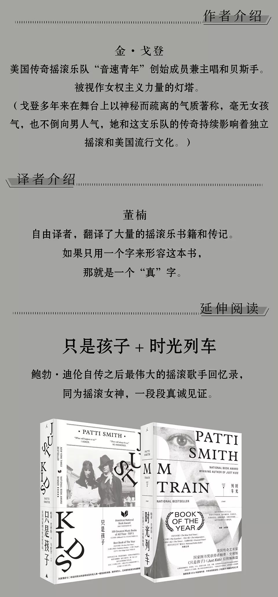 甚至在金·戈登决定写一本自传的消息刚刚传来的时候,就有人开始把这本书同帕蒂·史密斯获奖无数的自传《只是孩子》相提并论。