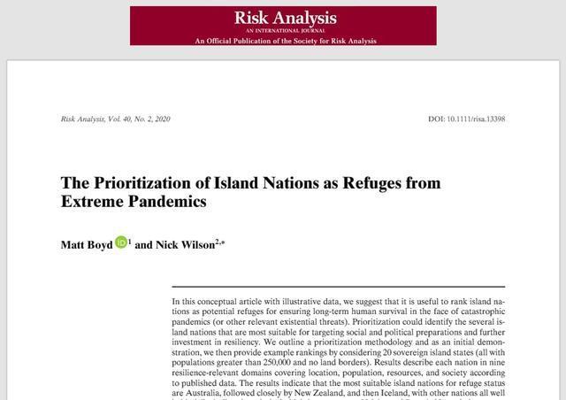 其实早在2020年3月份,新西兰的科学家就新冠疫情爆发而做过全球哪里最安全的调查并发表过一篇论文,而在他们的研究中,第一名是澳大利亚,第二名是新西兰。