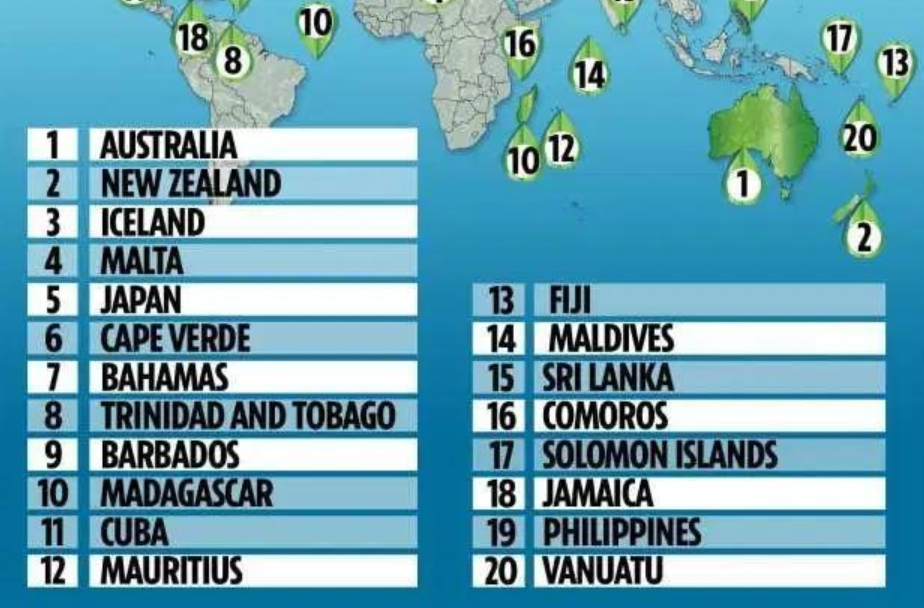 安格利亚鲁斯金大学全球可持续发展研究所的尼克·金和阿莱德·琼斯教授发起了这项研究,他认为,全球最安全的地方排名第一的是新西兰,其次是冰岛,然后再是英国、澳大利亚的塔斯马尼亚岛以及爱尔兰。