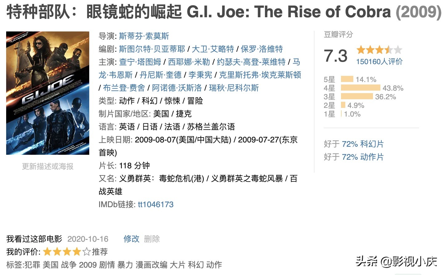 hey,小伙伴们,小庆姐又来啦!这回来写写派拉蒙电影公司2009年出品的好莱坞经典电影《特种部队:眼镜蛇的崛起》(g.i. joe: the rise of cobra),美国政府为了保卫国家而组成了特种部队——g.i.joe,由杜克领导这个特种部队来击退恐怖组织“眼镜蛇”,这是典型的正义对抗恶势力,豆瓣评分7.3,小庆姐给它4星,如果喜欢特种兵的小伙伴们,可以看看。