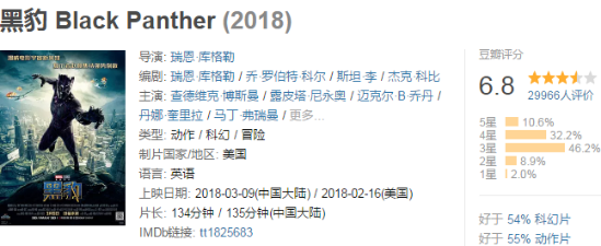 先来说说成绩,《黑豹》在全球市场的受欢迎程度想必各位早已经知道,少见的连续三周蝉联北美周末票房榜冠军,中国市场的表现同样亮眼,上映首日即斩获1.6亿票房,票房占比50%,豆瓣评分6.8,赢得开门红。