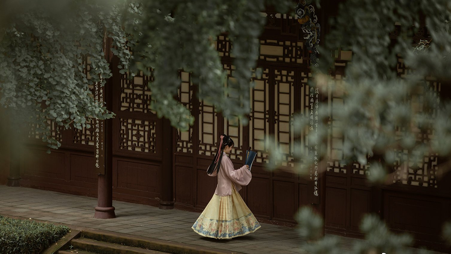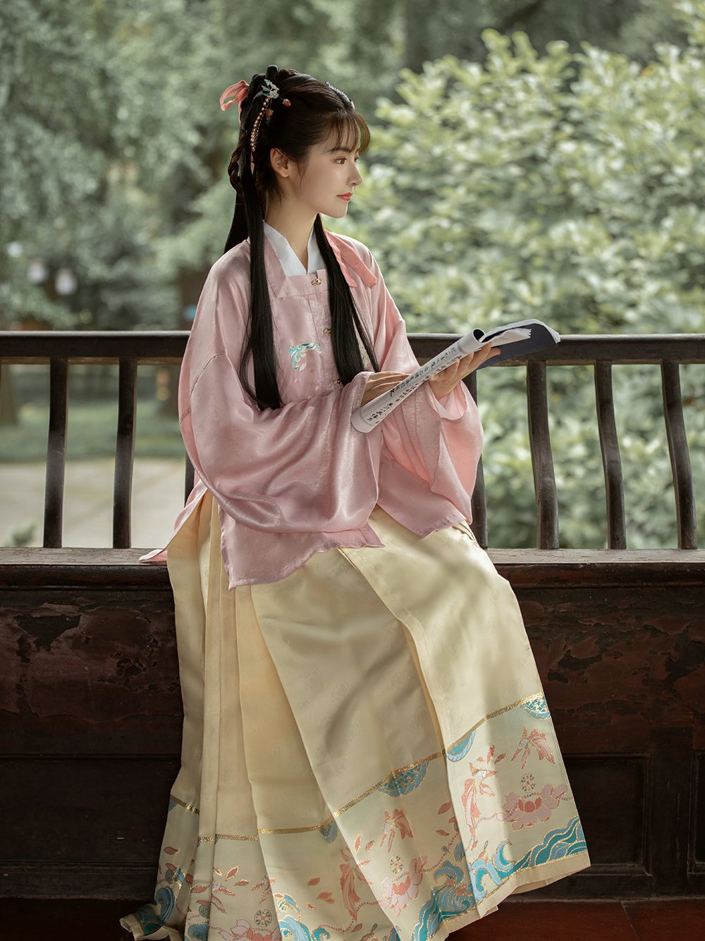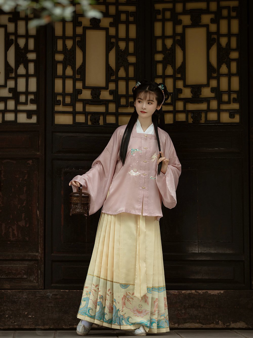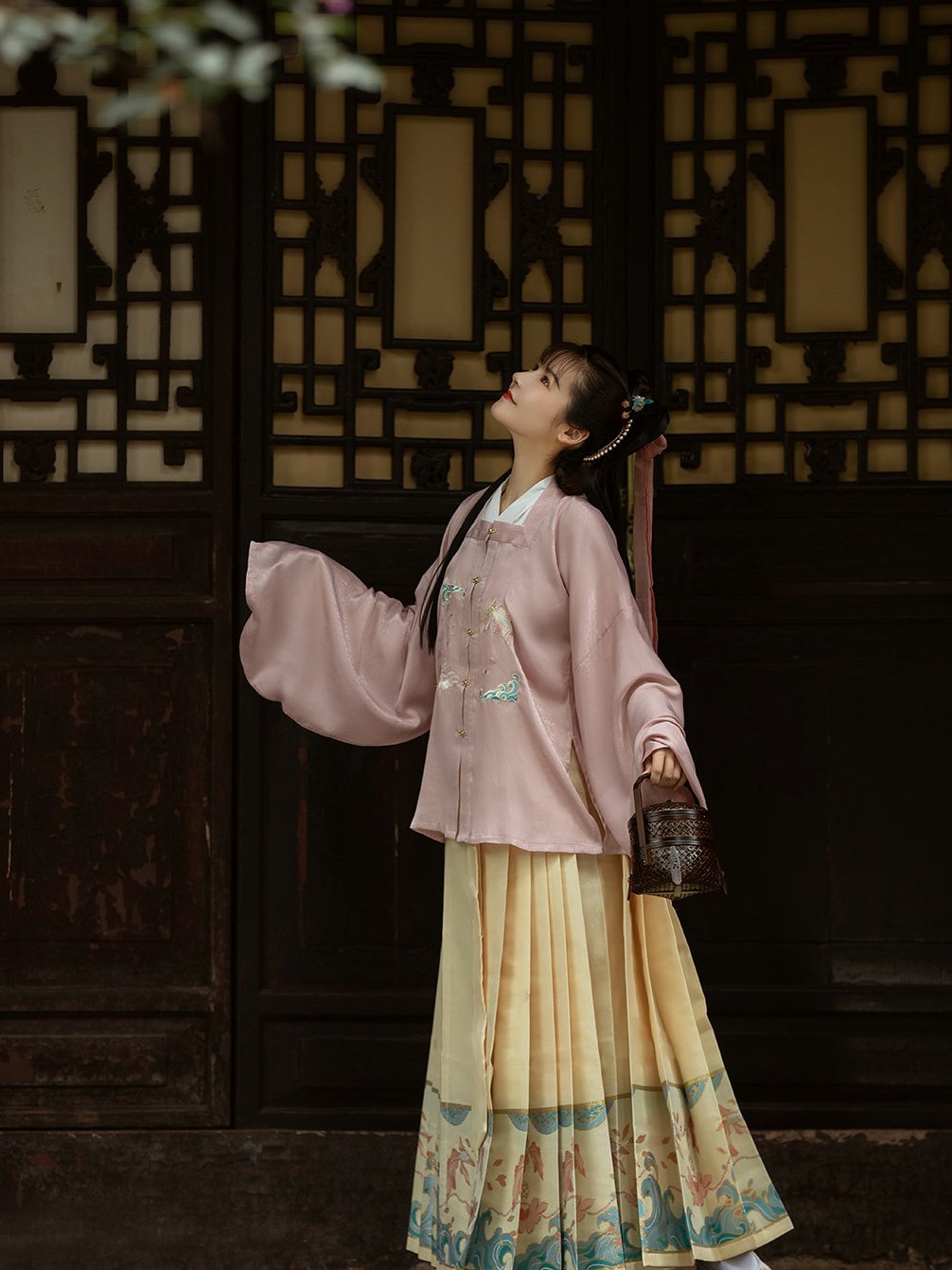 除此之外,花纹的颜色还要与整体汉服套装的色彩搭配相协调,就比如说豆绿色的裙摆可以搭配一些细小的深绿色的花纹等等。