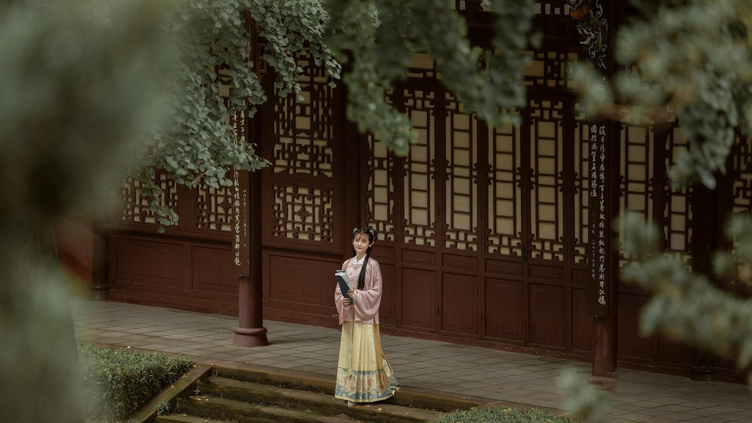 拥有一双星星眼的女孩子当然不能让身上衣服的花纹把自己的气质给压下去了!小姐姐选择的这一套汉服是比较素静的,只有胸口和裙摆的位置上有一些花纹,看上去简单而不单调。