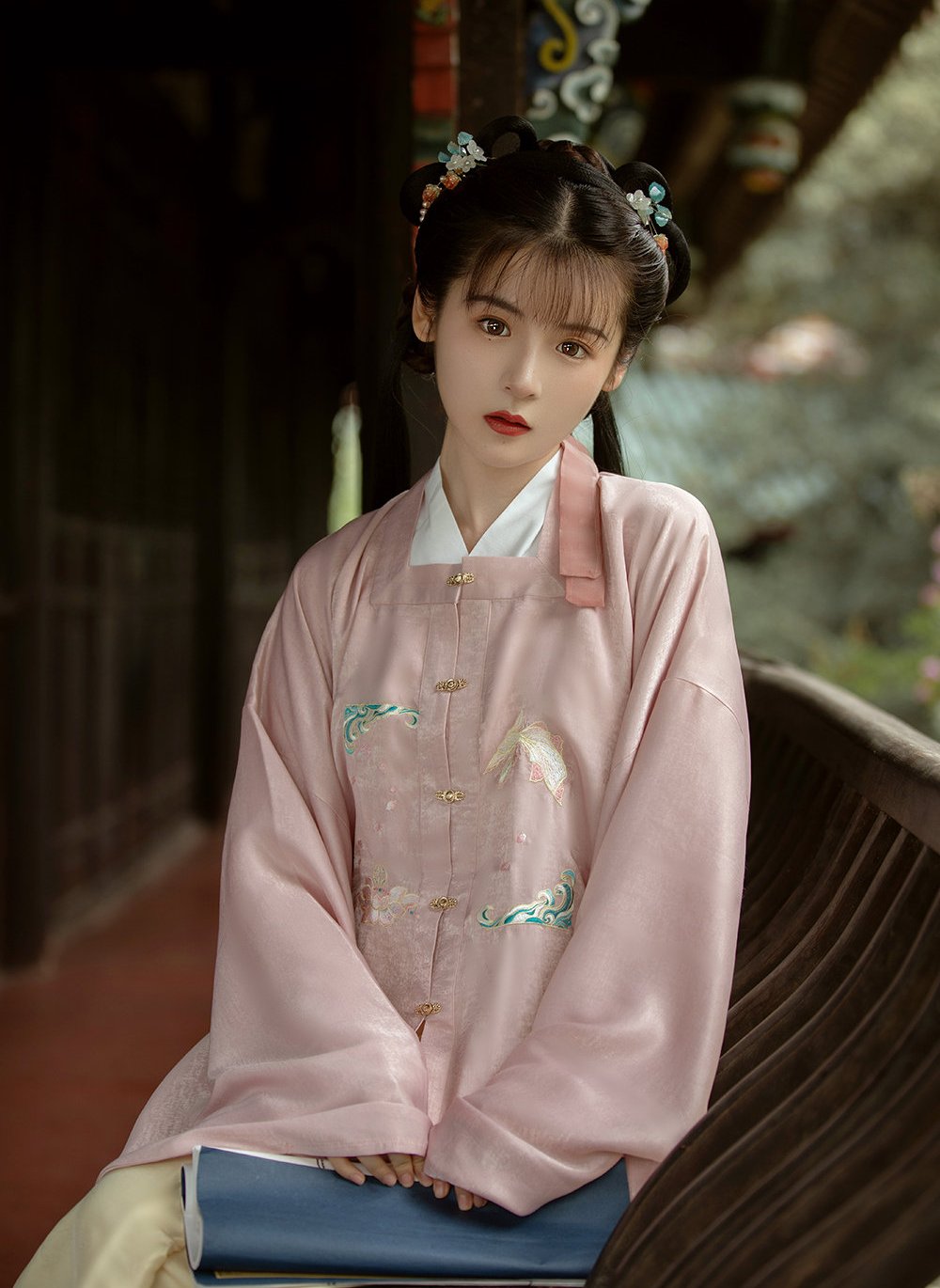 这个小姐姐的眼型是妥妥的杏眼,又大又圆的眼眸在阳光下像是倒映着星星一样,格外的可爱迷人。小姐姐选择的也是一套以浅色系为主的汉服套装,豆粉色的上装搭配着嫩黄色的裙摆,就像是春日中一朵含苞待放的小花,格外的讨人喜欢。