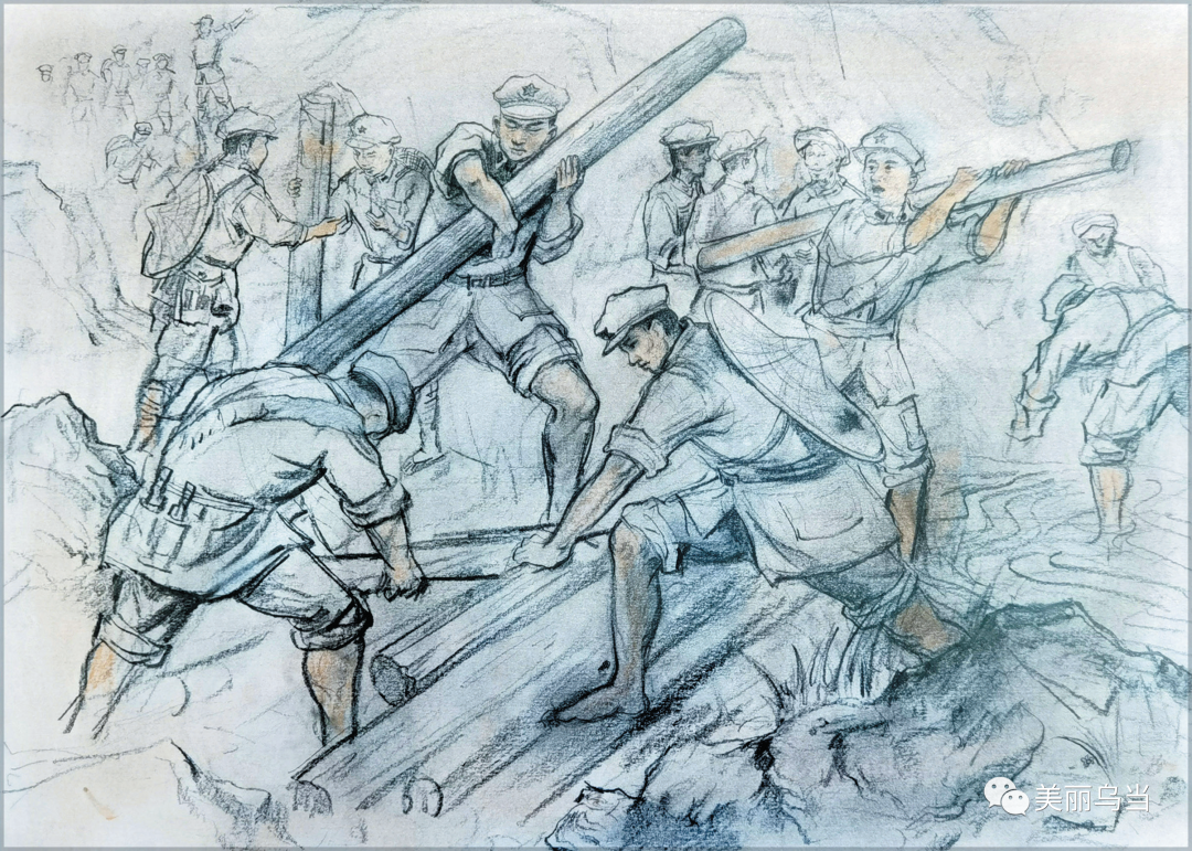 3、红军战士不顾疲惫协助帮忙建桥。