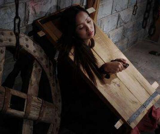 立枷呢?主体是笼子,顶部盖个枷。犯人头吊在枷上,脚尖踩于笼底。沈德符写到,“最毒则为立枷,荷此者不旬日必绝;偶有稍延者,命坐低三数寸,则顷刻殒矣”。