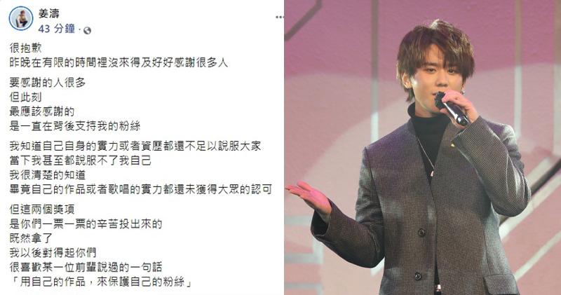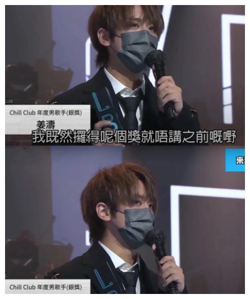 “我知道今日这个奖,有好多观众一定会讲‘姜涛到底值得这个奖吗’,但是无论怎样,我以后会用作品说话,希望全香港市民都一直督促我们这些偶像,看着我们成长。”