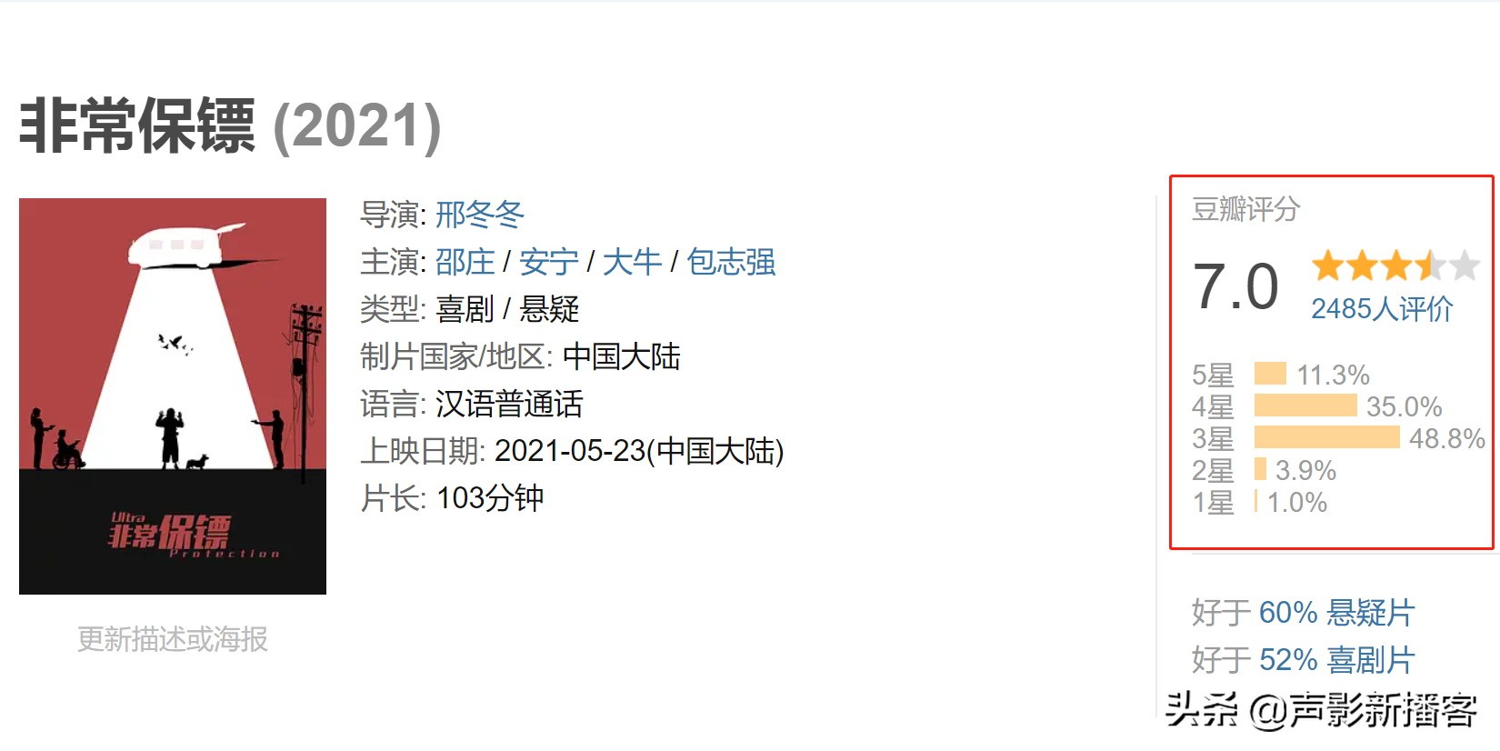 从《非常保镖》线上流媒体上映之后,该片的观众口碑也是表现稳健。到目前为止,豆瓣评分是7.0。由于现在电影是上映伊始,观看的观众并不算太多,仅有两千多人给出了评价。虽然与《毛骗》第一季的8.6分和《毛骗》终结篇的9.7分有些差距,但是随着电影热度的持续升温,越来越多的人观看电影之后都被精心设计的反转情节吸引,口碑评分会有进一步的提升。