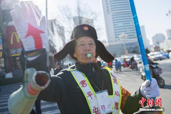 12月5日是国际志愿者日,在寒风凛冽的山西太原街头,77岁的志愿者马金明步履蹒跚地指挥交通。1974年,当服务员的马金明因工伤致下半身瘫痪,热衷公益的他却靠着坚强的信念,在21年后奇迹般地站了起来。从2010年开始,无论是寒酷节假,马金明都在这里义务疏导交通。中新社记者 韦亮 摄
