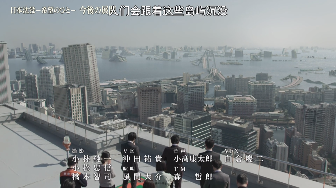 这一点我相信tbs是有自觉的,因为很难看到会有一部日剧在第一集的结尾,直接花上好几分钟,把后面9集的大概内容都剧透一遍了,和我猜的差不多,新《日本沉没》的剧情发展差不多就是从启动国民转移方案政府部门连携操作,到主角家人在乱世下的聚散分离,最后面对即将被海水淹没的大都会东京祈祷未来,提前剧透也是想让我这样的观众放心——别走开,日本真的马上就要沉没了。