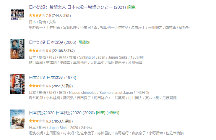 当然,以上这些不过是我抓出了新《日本沉没》前两集的槽点并放大吐槽了,实际上前两集看下来体验还算不错。在没有《半泽直树》的年份里,新《日本沉没》第一集15.8%,第二集15.7%的收视率,已经足够称得上“万人空巷”,这部剧现在在豆瓣上评分是7.9,属于还有一定的下降空间,但已经是原著改编的影视作品中最高分了。