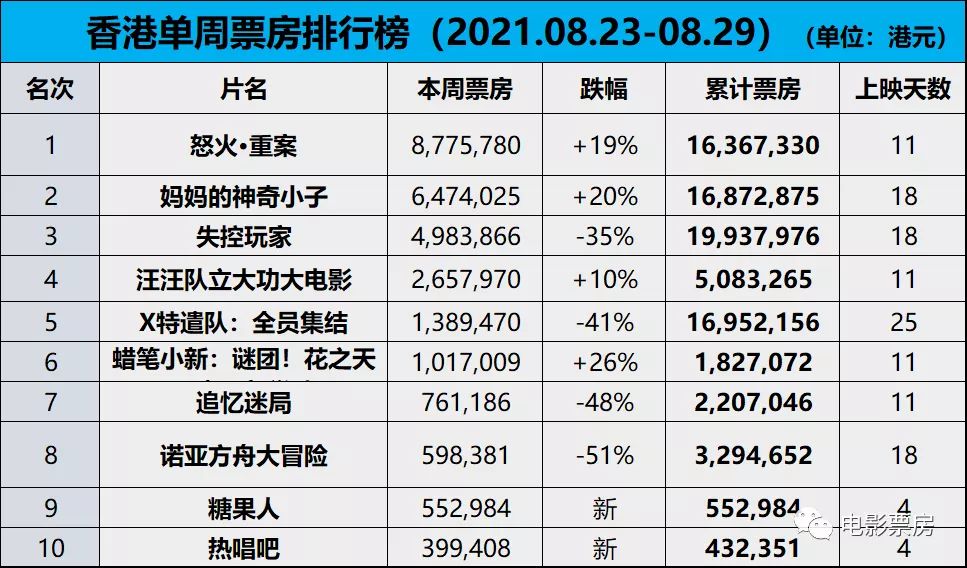 中国香港是全球极少数暑期档未受疫情影响的市场之一,近期在实力不错的华语电影以及好莱坞新片加持下,市场热度不断创造疫情以来的新高。上周虽没有新片开画突破百万港元,但得益于老片的出色走势,全港单周大盘仍高达至2750万港元以上,仅比此前一周下跌不到一成。港产犯罪电影《怒火·重案》次周逆跌近两成,逆袭《失控玩家》摘得单周冠军。吴君如主演新作《妈妈的神奇小子》连续两周大幅逆跌,升居单周票房亚军。美国科幻电影《失控玩家》单周再收近500万港元,退居单周票房亚军。美国动画《汪汪队立大功大电影》走势稳健,仍位列周末榜第四。dc漫改《x特遣队:全员集结》单周再收近140万港元,仍位列周榜前五。