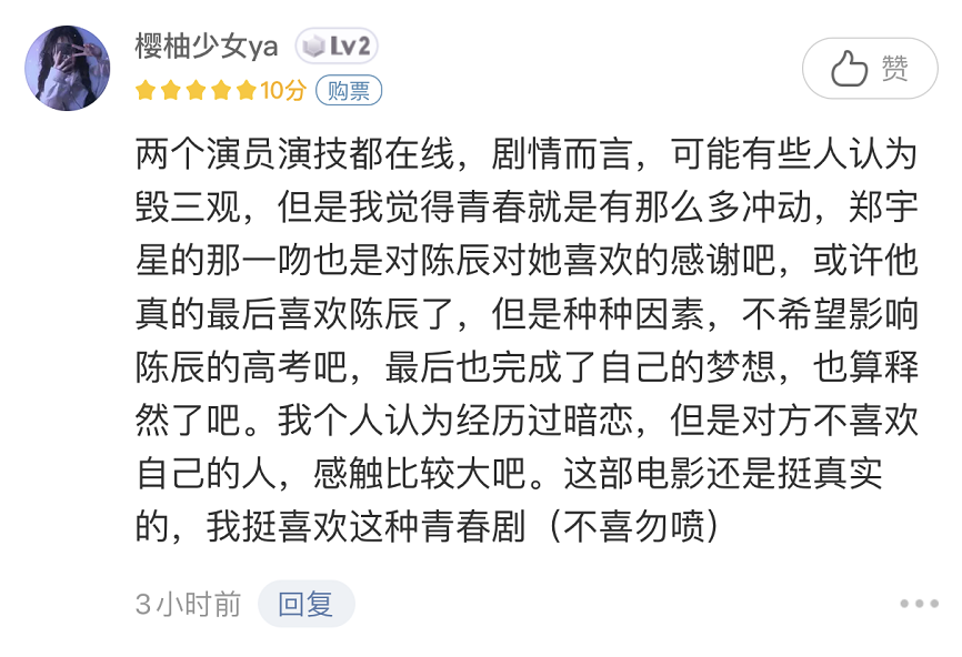 网友“樱柚少女ya”直言,两个演员演技都在线,并且自己觉得青春就是有那么多冲动,郑宇星的那一吻也是对陈辰对她喜欢的感谢吧。