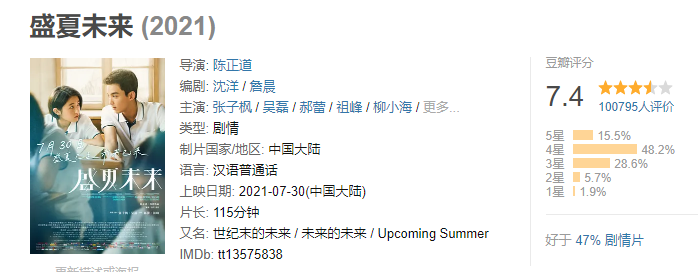 豆瓣虽然是一个比较严苛的地方,但《盛夏未来》的豆瓣评分依旧很高,拿到了7.4的高口碑评分。