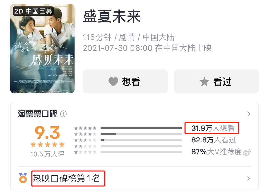 购票平台淘票票上的观众,对《盛夏未来》评价很高,想看人数超31万,同时还是热映口碑榜的第一名。