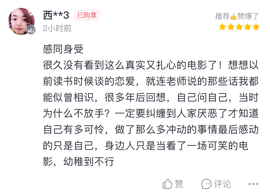 网友西**3则被电影瞬间拉回到自己的青春中,她表示想想以前读书时候谈的恋爱,就连老师说的那些话都似曾相识,很多年后自己问自己,为什么当时不放手?