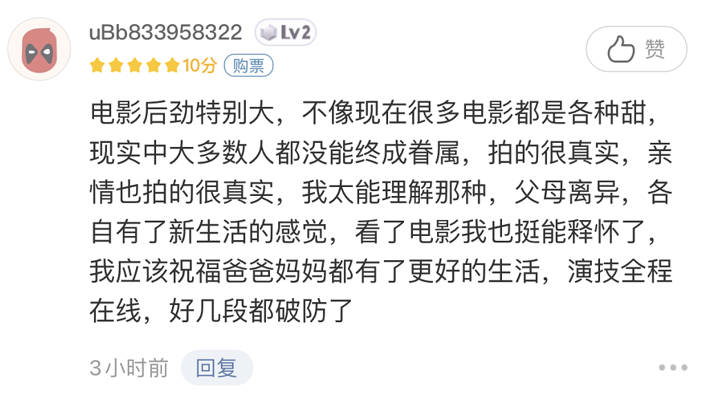 网友“ubb”则坦言,电影的后劲特别大,不像现在很多电影都是各种甜,现实中大多数人都没能终成眷属,拍得很真实,亲情也拍得很真实,他很能理解那种父母离异,各自有了新生活的感觉。