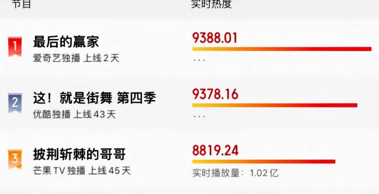 相对于前两期预热节目来说,第4期到了《最后的赢家》高光时刻,上线仅仅两天,就在综艺热度排行榜中冲到了第1名。