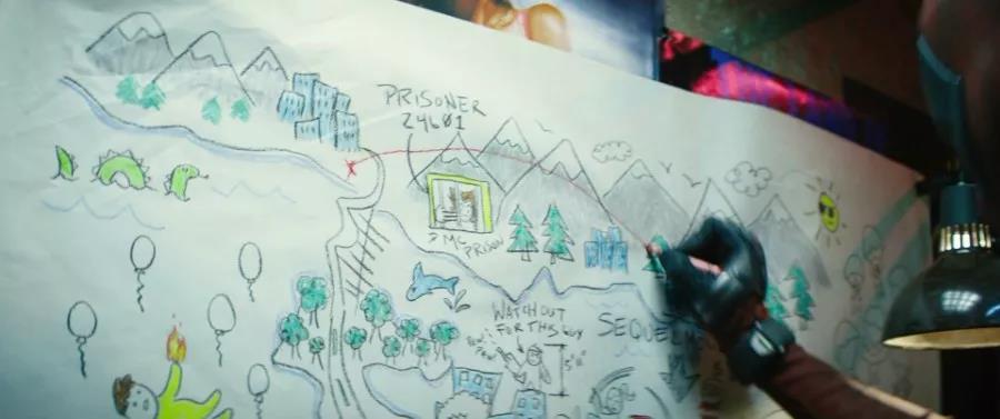 除了几个比较明显的狼叔梗,影片中还有一个相对隐秘的休叔/金刚狼彩蛋。在贱贱向x特攻队讲述作战计划时,图纸上画有一个被囚禁的金刚狼,并写着“prisoner 24601”。