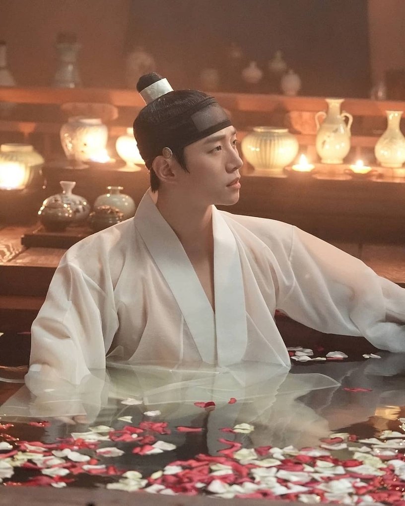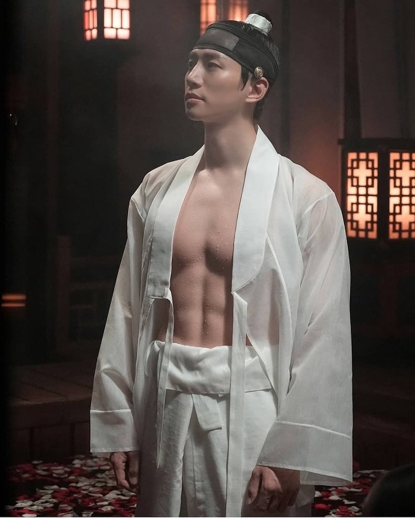除了以上几套,当然也不能错过世孙沐浴时穿的白色里衣。这大概是很多人最喜欢的造型了吧~(误) 最近俊昊的经纪公司,也公开了这段的幕后拍摄花絮,只见殿下穿着一层薄薄的白色里衣,浸泡在玫瑰花瓣里,整个人说有多性感,就有多性感!更犯规的是,殿下还有明显如冰块盒的八块腹肌,真的要让人喷鼻血了啦~