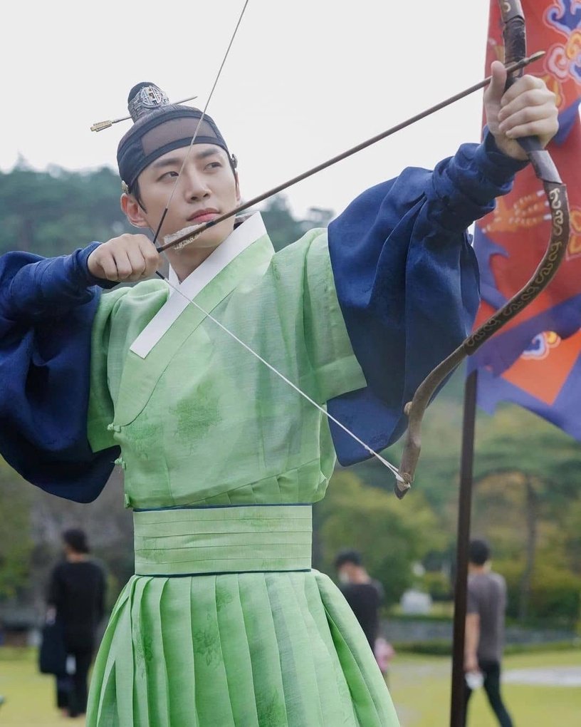 其实世孙殿下光是射箭的场景,就出现过很多套不同的韩服。像是最初打老虎时,世孙穿的是一身深蓝色劲装,蓝白色的搭配,在手臂部分还用深蓝色绑带层层缠绕,这造型连小细节也设计得很有美感。相比之下,红色那套射箭装更有身为王的霸气,蓝色这套则更凸显世孙的少年英气。