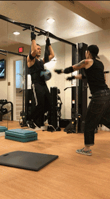 除了做腹肌轮,黄晓明还要求健身教练加强难度,在引体向上时继续虐腹肌……