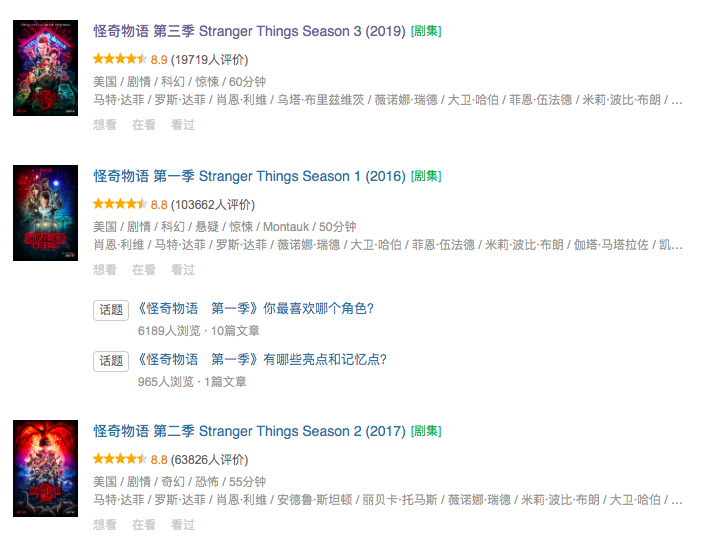 这一部剧不仅仅在美国取得了非常优秀的成果,在中国观众的眼里这部剧也是非常的优秀,《怪奇物语》第一季在豆瓣的评分为8.8,《怪奇物语》第二季在豆瓣的评分为8.8分,第三季虽然在国内还没有播出,但是豆瓣评分8.9已经出来,很多热爱这部剧的网友已经想尽一切办法观看了此剧,评风也是一片大好,估计最终的分数丝毫不会逊色前两季。