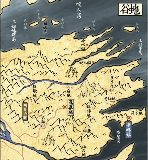 谷地的地形是这样的。多山,但也多良港。他们往南出山只有一条大道,但往北通过海路很方便。可能正是地理的原因,征服战争之前,谷地很少往南争夺河间地的权力,但却经常和北境争夺海上的权力。也正是地理的原因,如果谷地内部有纷争或是乱局,他们可能就打不出去,对其它各王国的影响就不会太大。