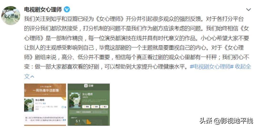 而此时,《女心理师》剧组也通过官微表达了看法,称已经关注到了各个平台的分数和观众的反馈,无论分数高低他们都接受,打分数也不是剧组考虑的问题。
