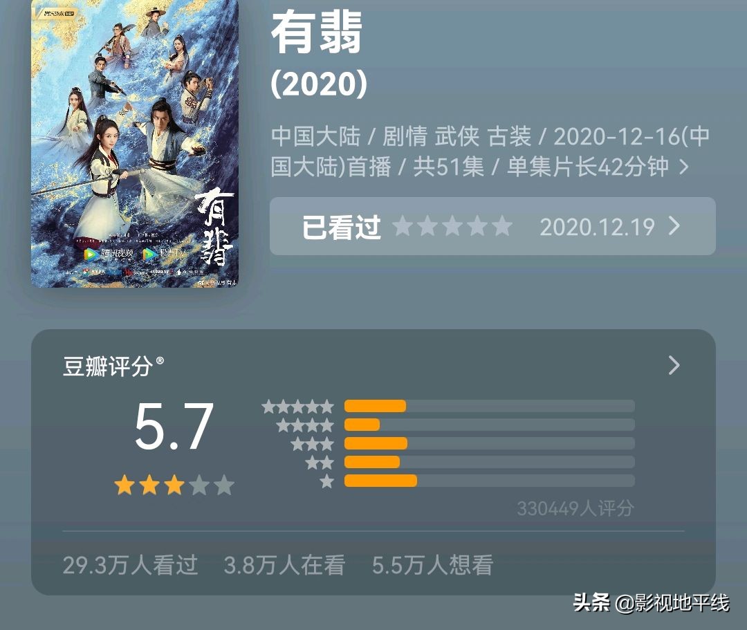 这让我想到了针对豆瓣评分机制讨论最激烈的一次,那就是赵丽颖和王一博主演的《有翡》。那时候当《有翡》5.7分的口碑出来后,网络上的讨论轰轰烈烈。