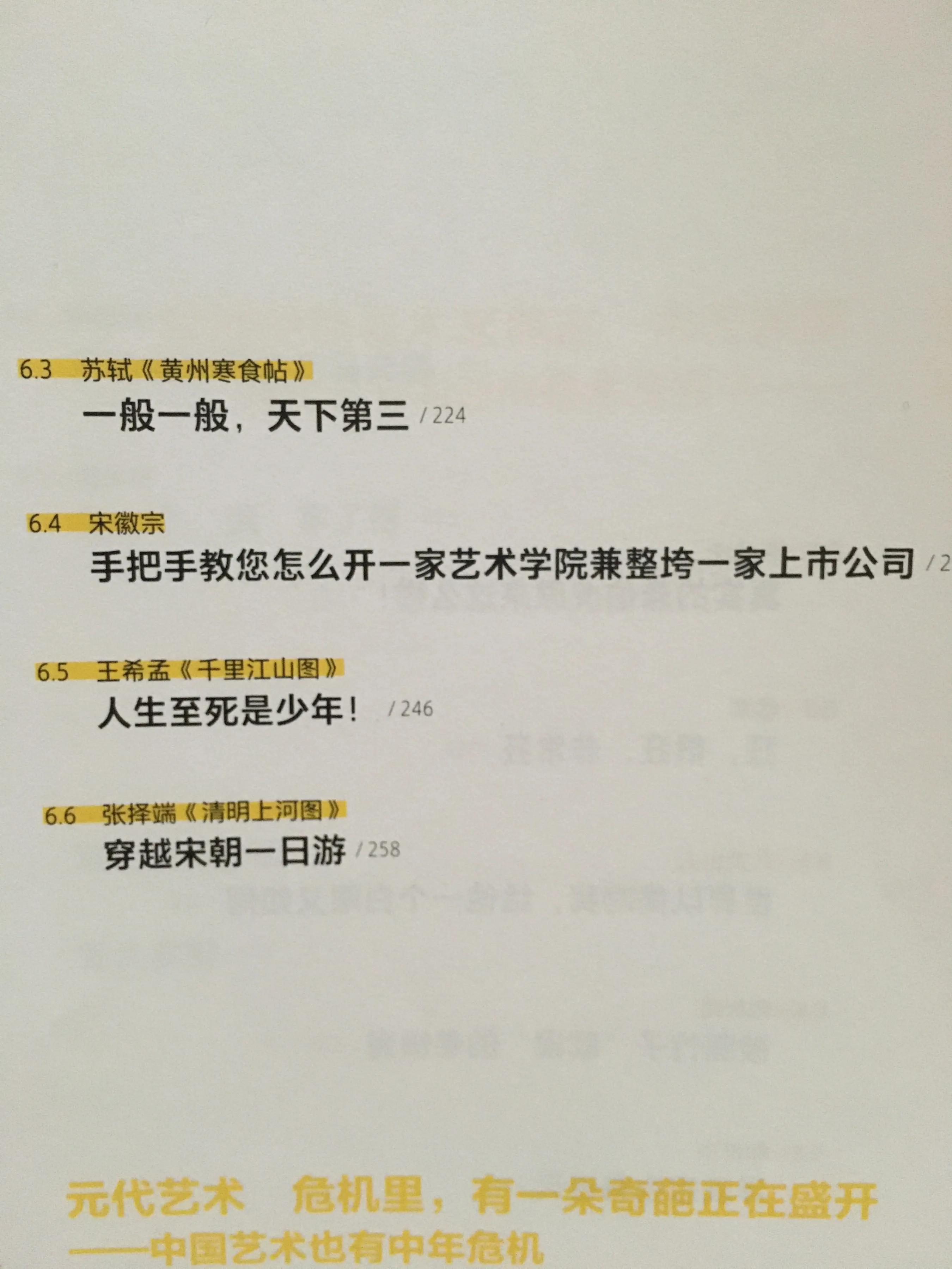 还有《死后的世界长啥样》通过一幅丁形帛画告诉人们答案,其中的人物表情是丰富的,天国的世界是一片祥和瑞气,有长生不老的丹药,有神龙瑞兽的恭迎,特别有仪式感。再说宋徽宗吧,给他的盖棺定论是《手把手教你怎么开一家艺术学院兼整垮一家上市公司》读完文章,我对这标题拍手称快了。文中挖崛出宋徽宗评价绘画的过人之处,他说春天中午开放的玫瑰花蕊和叶子就是朝这个方向的。你说这个皇帝是不是很吓人。这本《大话中国艺术史》是我读过的最有趣的艺术书籍,绝对是第一,没有第二,我被书中风趣的语言逗乐了,被艺术的精美震撼了,被书中名人背后的事迹触痛了。书中的画值得永远留存,细细赏玩。