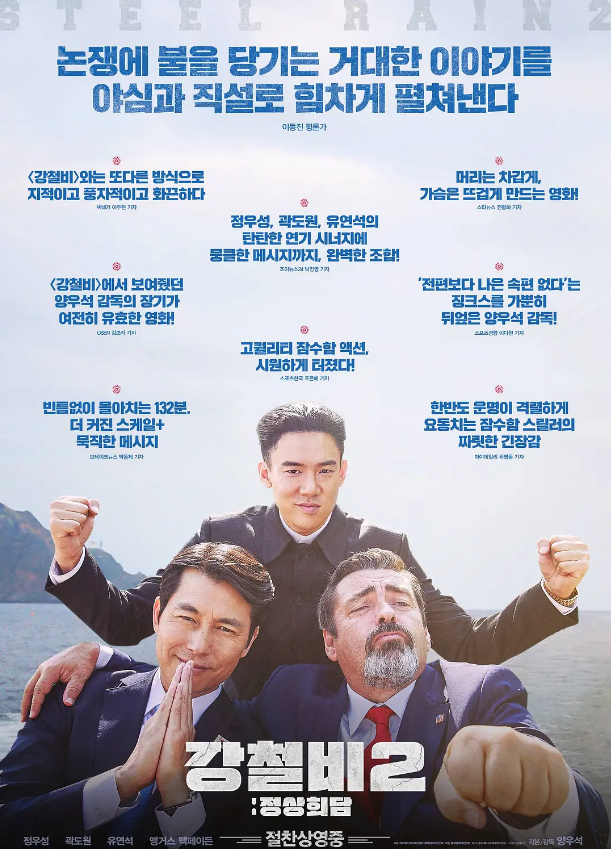 可惜剧情虽然惊爆吸睛,但电影前半段过于磨叽,有些影响观感。直至全片过半,美韩朝三国领导被关进核潜艇监房,绑架实施完毕,电影节奏才如同跃出潜艇发射仓的鱼雷一样,陡然加速....