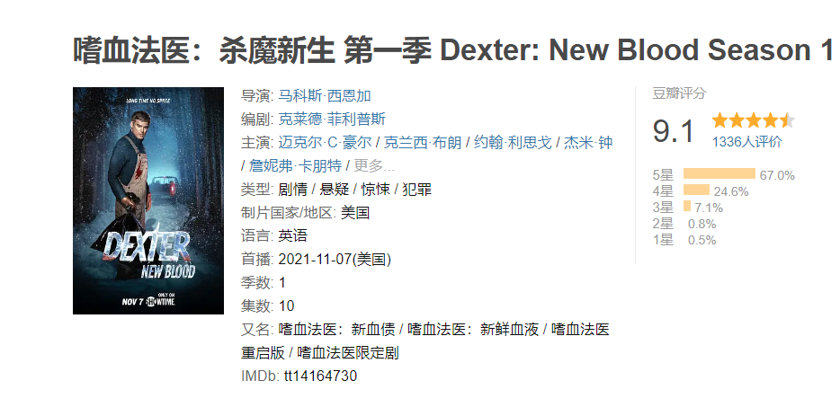 《嗜血法医》可是一部老剧,这种提供新剧下载推荐的网站,怎么会推荐这么老的一部剧?我仔细看了一下,竟然是2021年的新剧,豆瓣搜索一下,果然《嗜血法医:杀魔新生》第一季,评分高达9.1。