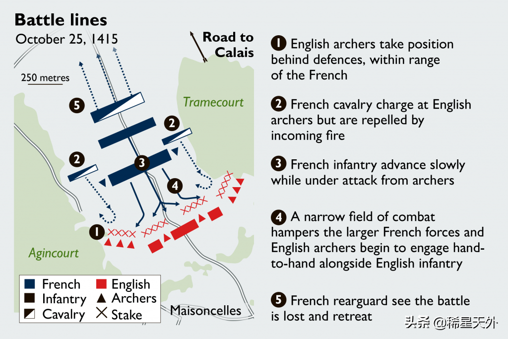 亨利国王戴着王冠和羽冠,不断地鼓励他的士兵,告诉他们他将亲自统领中军与他们并肩作战。右翼由托马斯·埃尔平汉爵士(sir thomas erpingham)指挥,卡莫伊斯勋爵(lord camoys)则指挥左翼。茂密的森林将两支军队围在一个约 900 米宽的狭窄空间内,但法国人确信他们的骑兵仍有空间对英军实施侧面迂回并最终包围他们,然后从四面八方攻击那些致命的弓箭手。法军约三分之一是骑马的贵族骑士,剩下的则是徒步作战的步兵。他们的军队被分为三波:前锋、主队和后卫。前锋中阵和主队由下马骑士组成,前锋的两翼和后卫则是骑兵队。布锡考特元帅和德勒伯爵与波旁公爵和奥尔良公爵一起统率前锋。