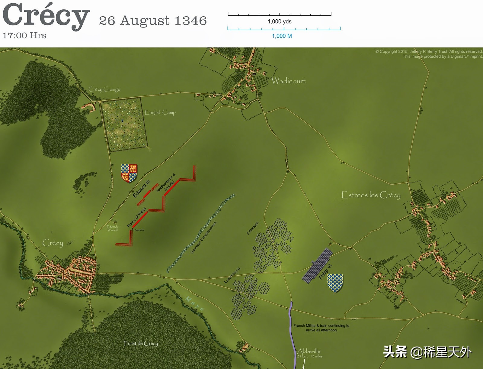 法军指挥官德勒伯爵和他的部下原本打算在他们自己位于阿比维尔(abbeville)和亚眠(amiens)的据点附近与英格兰人交战。对于法国人而言,爱德华三世1346年在附近的克雷西(crécy)大获全胜的场景依然记忆犹新,他们渴望69年后能在同一片土地上一血前耻。然而,这个计划最终没有实现,法国人在索姆河拦住了英军。