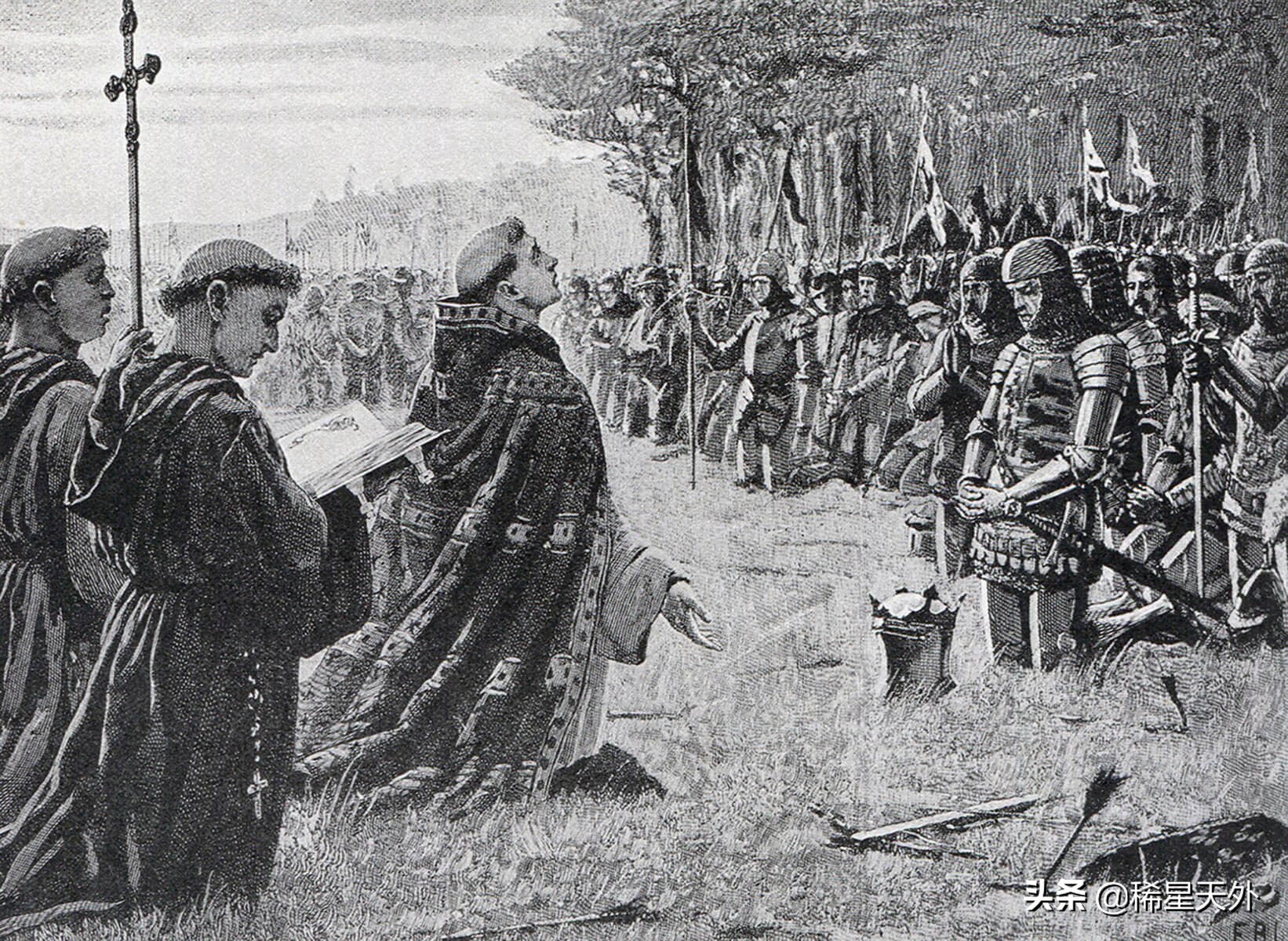 尽管亨利率领的是一支英格兰军队,但许多长弓手都是威尔士人。长弓首先在威尔士得到大量使用,军队中一些最优秀的弓箭手都来自那里。这些弓箭手与500名步兵站在一起紧张地排着行列。他们中的许多人都是战场菜鸟新兵,而不是经验丰富的老兵。他们看着法国人在他们对面集结,每一行的人数大约是他们这边的六倍。