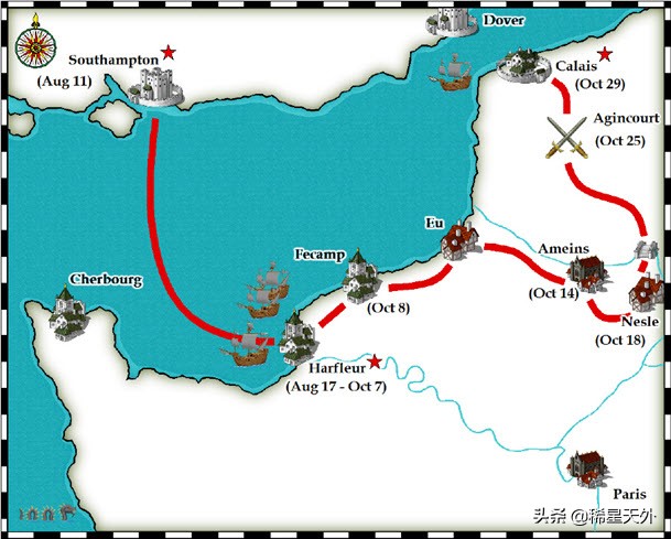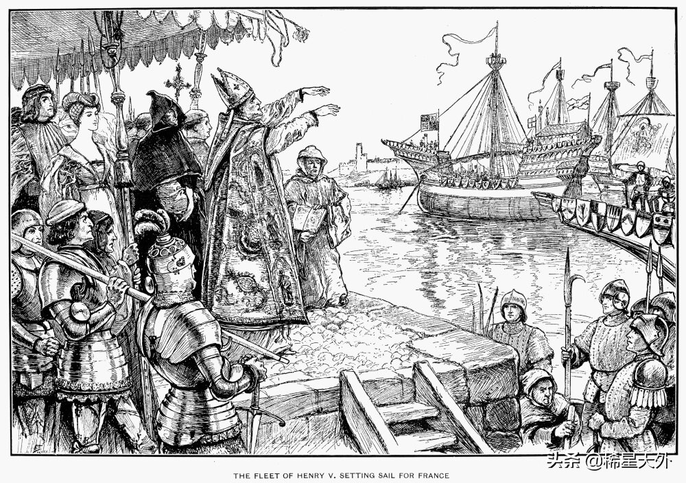 到1415年夏天,英法百年战争的第一阶段基本结束。法国已经收复了被英王爱德华三世侵占的大部分土地。尽管阿基坦(aquitaine)和加莱(calais)仍被英国人占据,但这些来自海峡对岸的入侵者几乎被完全赶出了诺曼底和佛兰德斯。此时,新国王亨利五世已经在英格兰登基两年了。这位战士国王开始计划重新进入法国,恢复英国在法国大片土地上的统治。