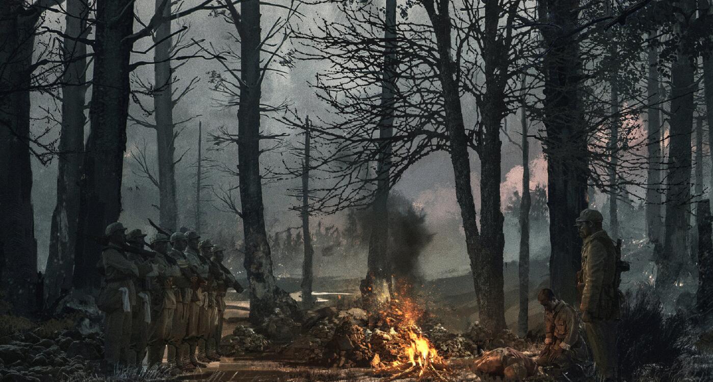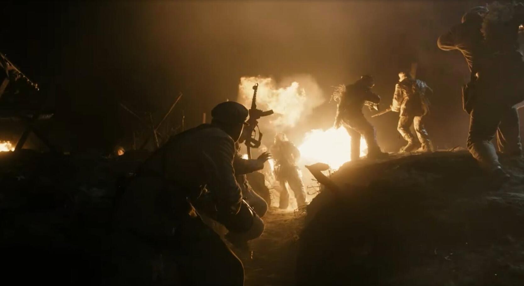 根据曝光的概念画,中间还有一段他们下葬战友的戏,万里跪在战友的尸体前,其他人严肃地站在旁边,火堆旁还有其他战友的坟头。还有另外一场疑似小村信号塔大战后的下葬戏也被删除。