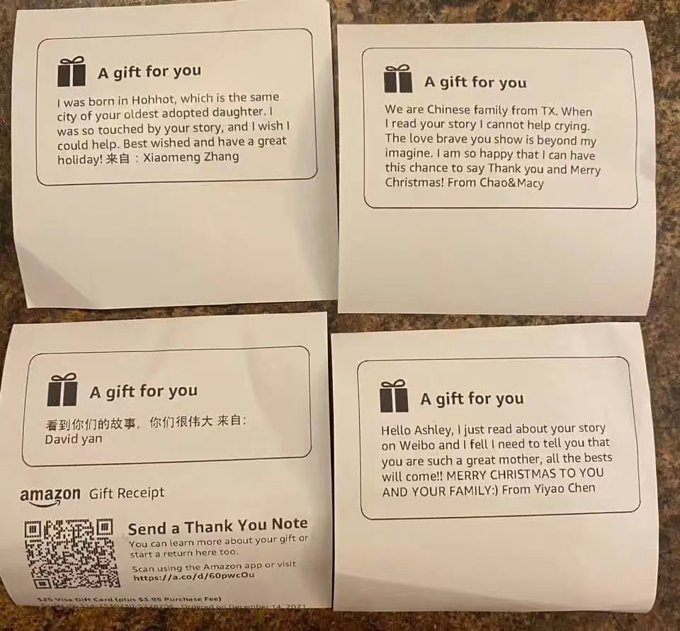 直到一天,有一位领养妈妈联系mandi,说有一群中国女士想为像她这样的家庭送上祝福,还让她列出心愿单。mandi抱着试一试的心态列了一个清单,几小时内,心愿单就被买完了。后来,她将其他领养朋友也拉了进来,就这样,加入爱心活动的美国家庭越来越多。