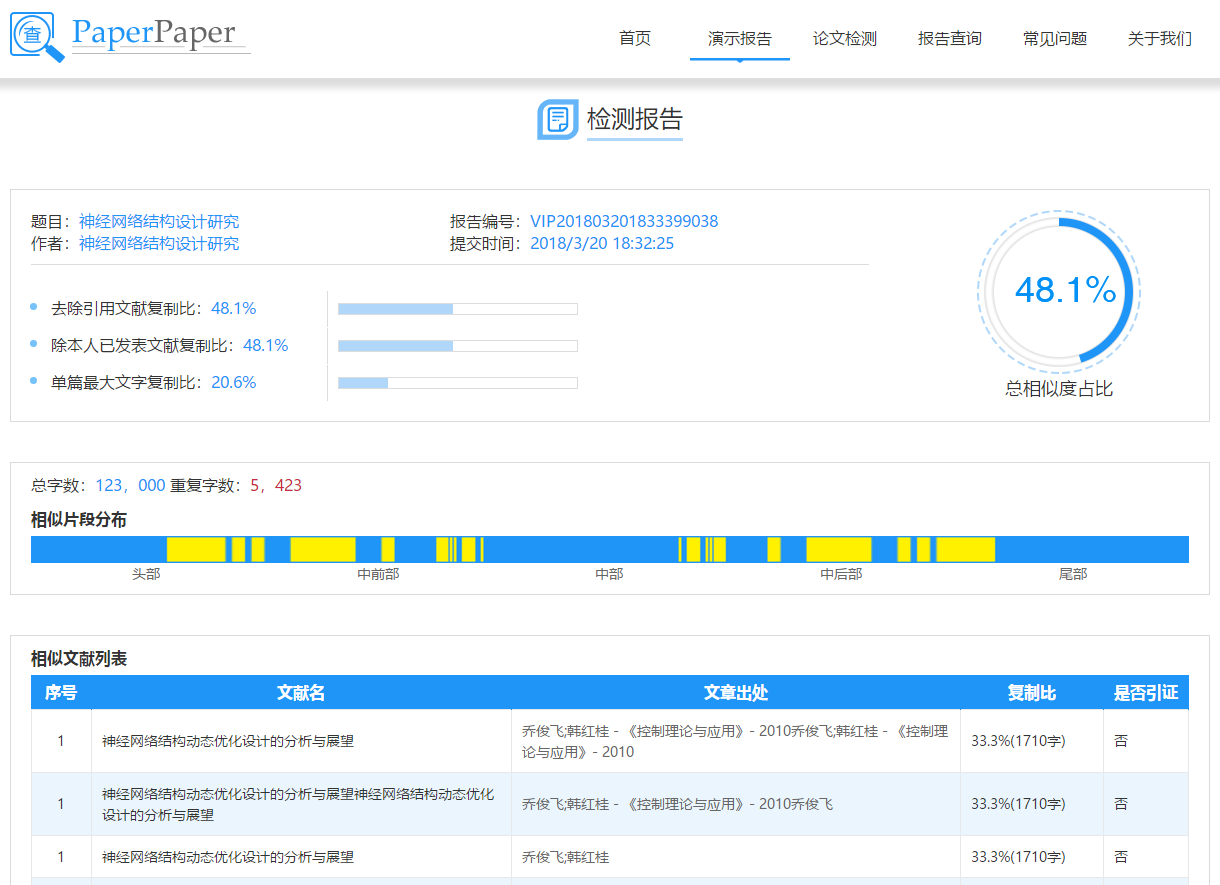 ▲主要分为三个部分:相似片段分布、相似文献列表、全文对照。