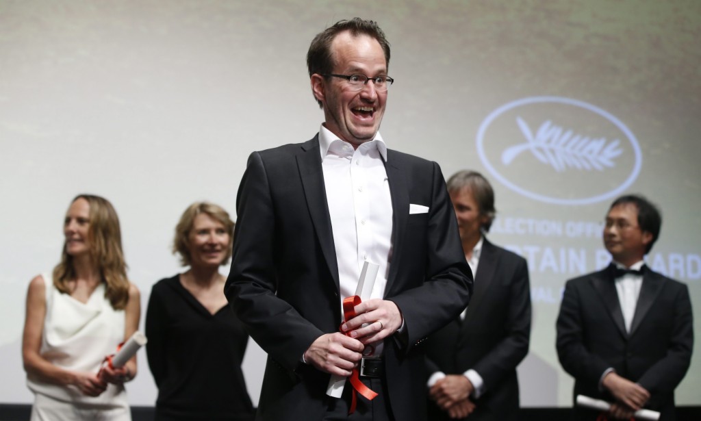 5月21日,在法国戛纳,芬兰导演尤霍·库奥斯马宁(中)登台领奖。当日,第69届戛纳电影节“一种关注”单元奖项揭晓,尤霍·库奥斯马宁执导的影片《奥利最开心的一天》夺得最佳影片奖。新华社外代图片 北京2016年5月22日 新华社/欧新中文